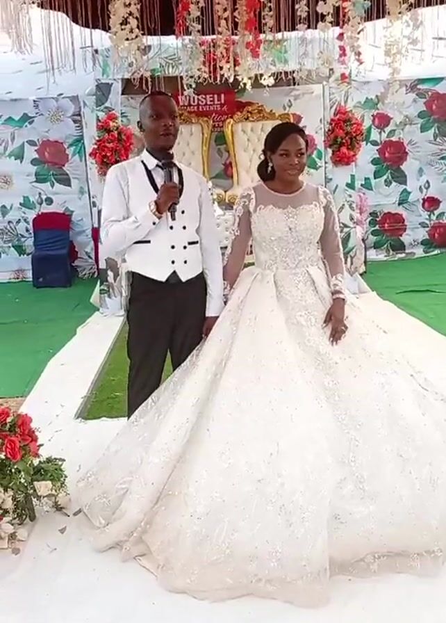 A man and woman stand side by side at what appears to be a wedding reception. The man is light-skinned, wearing a black suit with a white vest and holding a microphone. The woman is darker-skinned, wearing a large white wedding dress with long sleeves. They are standing on a small green carpet, in front of a white backdrop with red roses printed on it. Above them is a ceiling decoration made of string-like material. The man seems to be speaking into the microphone, possibly addressing the guests. There are two decorative chairs behind them, adding to the wedding atmosphere. The scene is brightly lit, suggesting an indoor location.