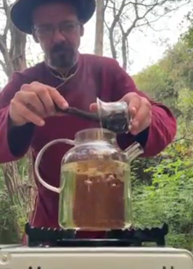 A man wearing a dark fedora, glasses, and a burgundy tunic-style shirt with white trim around the neck, is adding dark loose-leaf tea to a clear glass teapot. The teapot is sitting on a silver camping stove, which is placed on a table outside amidst greenery and trees. The man uses a small, clear glass pitcher to add the tea, holding the pitcher steady with a small black utensil. Steam rises from the teapot.