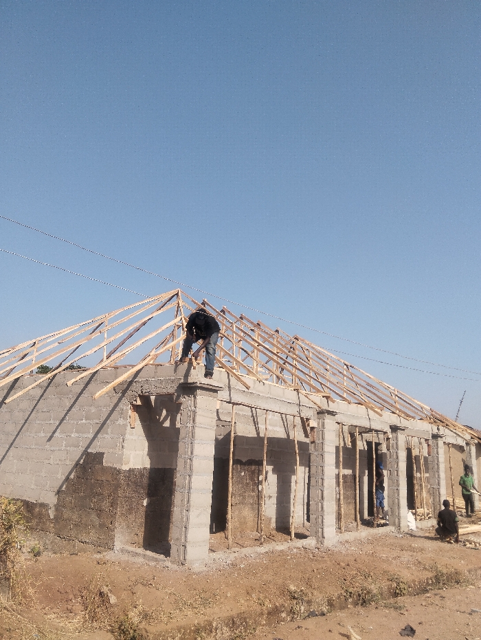 An outdoor construction scene in Unguwan Rimi, Nigeria, depicts the ongoing construction of a single-story building under a clear blue sky