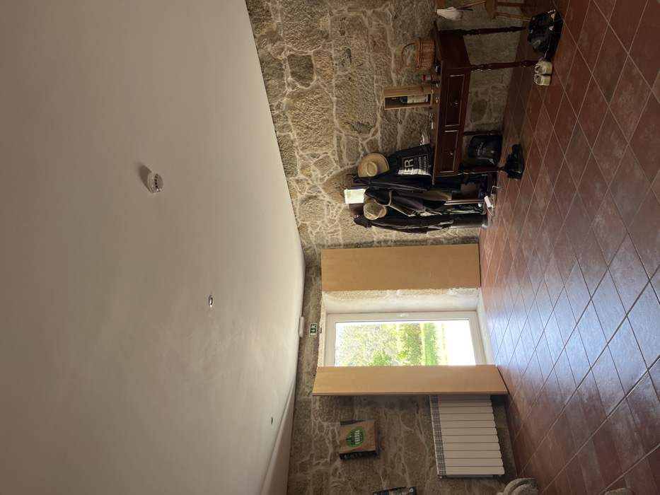 The image displays an interior room, likely an entryway, within a building located in Oliveira de Frades, Portugal. The room features robust walls constructed from irregular, light brown and grey exposed stone masonry. The ceiling is flat, white, and equipped with recessed circular spotlights and a centrally mounted white smoke detector. A green and white emergency exit sign is fixed above a wide, central doorway at the far end of the room. This doorway is composed of a white-framed glass door, open to an exterior view of bright green foliage under sunlight, and flanked by two tall, light-colored wooden panels. The floor is covered with square, reddish-brown terracotta-style tiles. Along the left wall, a white horizontal panel radiator is installed. Above it, a brown paper bag, partially visible and displaying the text "FRESIA," hangs from the stone wall. On the right side of the room, against the stone wall, stands a dark wooden console table with turned legs and two drawers. Various items are placed on its surface, including a wooden box containing a wine bottle, a small wicker basket, and several small miscellaneous objects. Behind the table, a coat rack is laden with multiple dark jackets and coats, two hats (one straw-brimmed), and a dark bag with "LER" and "turismo rural" text. On the floor in front of and to the right of the console table, several pairs of footwear are present, including dark boots, black athletic shoes, and light-colored sneakers. A portion of a light-colored wooden chair is visible on the far right edge of the frame. The room is illuminated primarily by natural light emanating from the open doorway. No individuals are present in the scene.