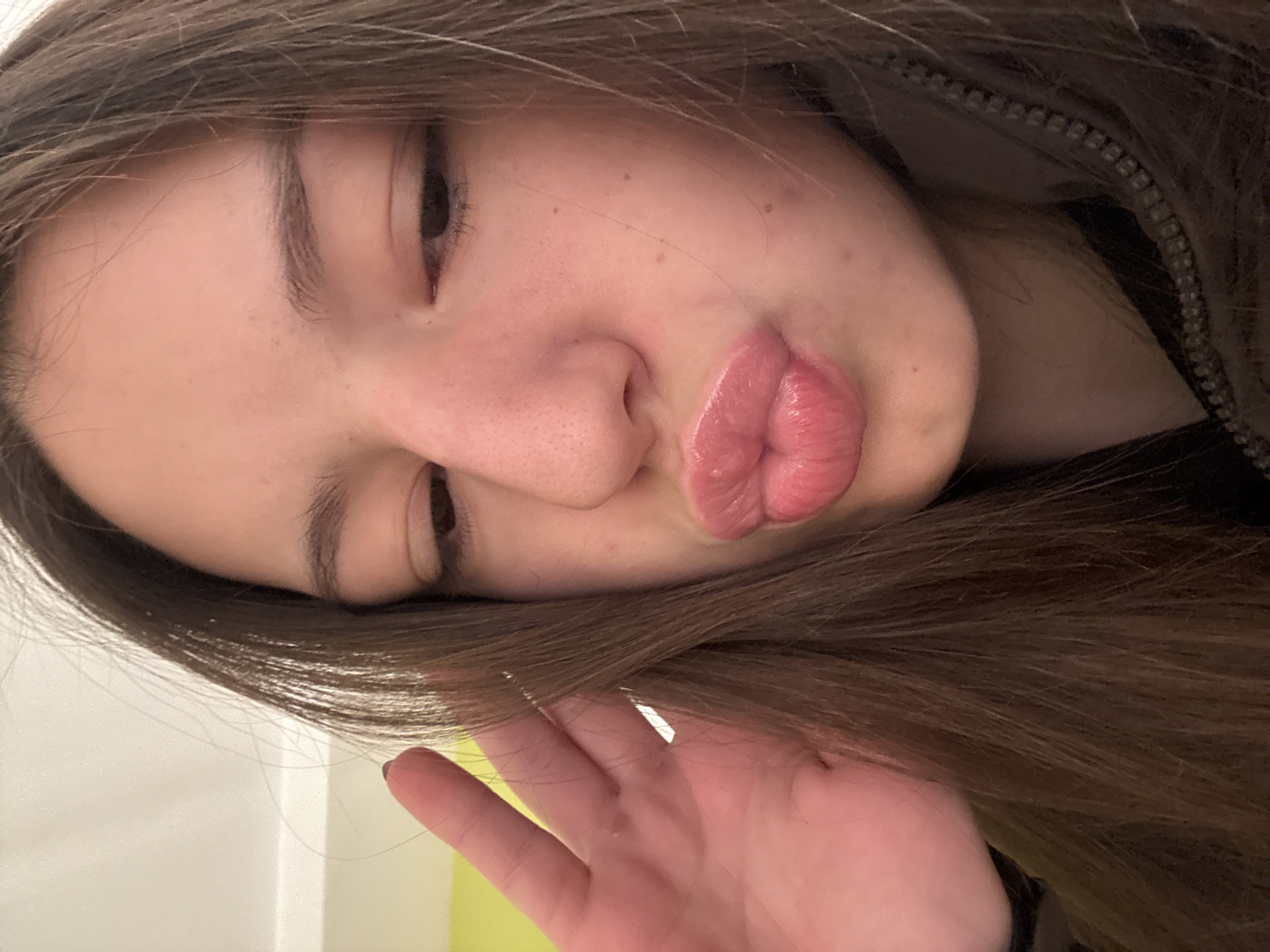 A close-up, vertical-format image displays the upper body and face of a young female subject. The individual has long, straight dark brown hair, fair skin with visible pores and minor facial blemishes, and dark eyes cast downwards and to the right. Her lips are pursed in a prominent "kiss" gesture, appearing glossy and pink. The upper portion of her left hand is visible on the left side of the frame, with extended fingers; one visible fingernail displays dark red polish. A dark-colored garment with a visible zipper closure is present on the right side of the frame. The background consists of a plain interior wall, predominantly light-colored, with a segment of pale greenish-yellow visible behind the subject's left hand. Lighting is even, characteristic of an indoor setting. No specific environmental markers are present to determine an exact location within Velingrad, Bulgaria.