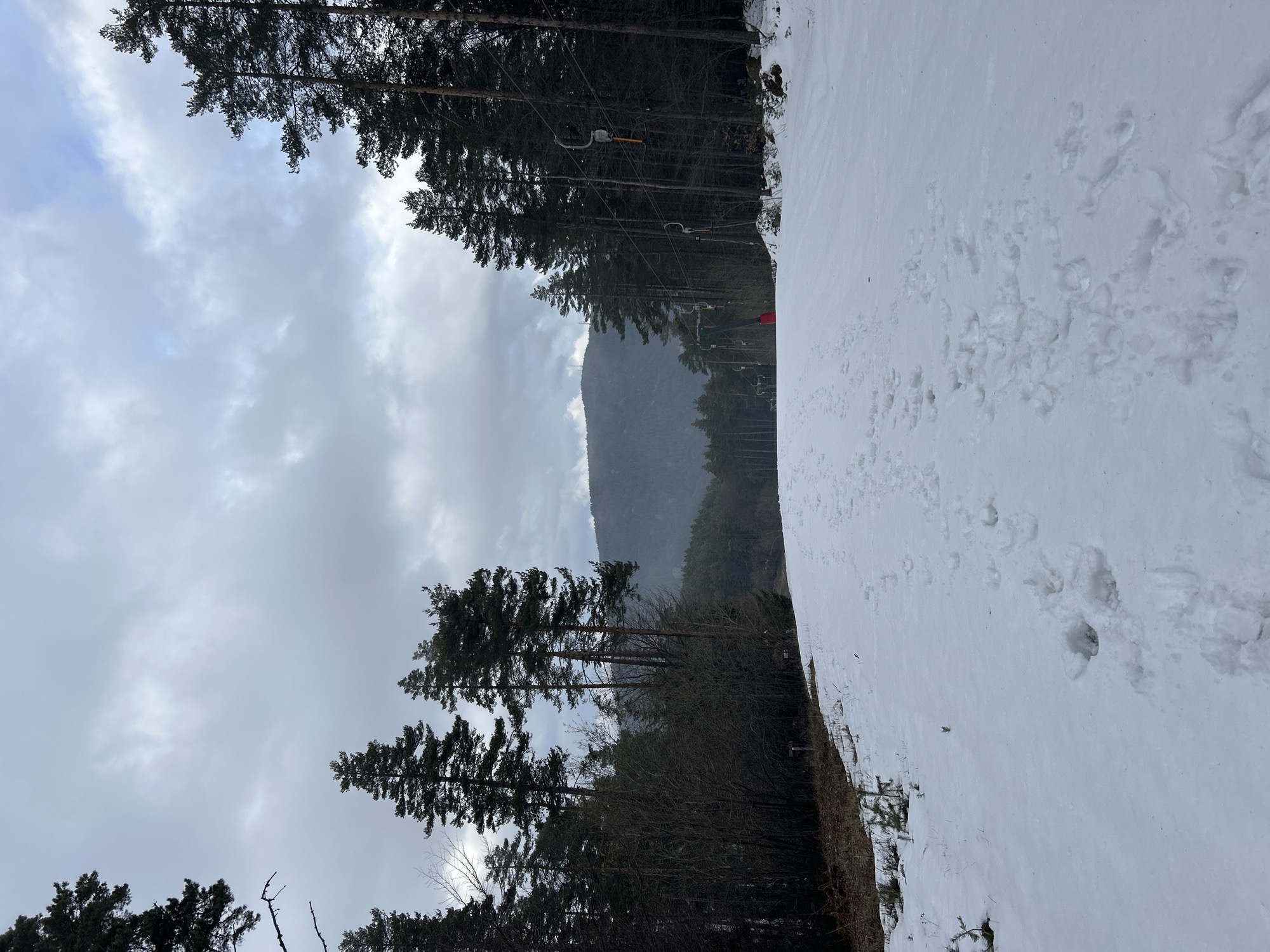 The image presents a snow-covered ski slope or forest path in Dedovo, Bulgaria, under an overcast sky. A wide path of undisturbed snow, marked by numerous human footprints, extends from the foreground toward the background, narrowing slightly. Dense forest lines both sides of the path, consisting primarily of tall, slender coniferous trees; some bare deciduous trees are also visible, particularly on the left. On the right side of the path, a ski lift system is present, featuring multiple empty chairs suspended from a cable, with the base of a red support tower visible in the mid-ground. In the distance, a prominent mountain range is visible, topped by a slender structure, likely a communication tower. The sky is entirely covered by gray clouds, indicating an overcast weather condition. No individuals or animals are visible within the frame.