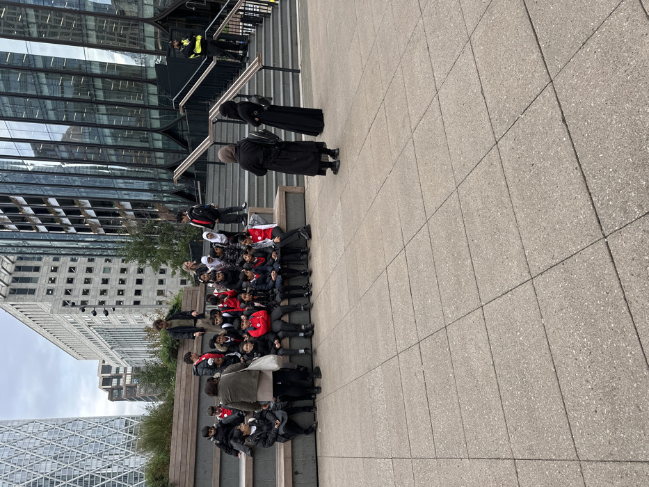 This image depicts an outdoor urban scene in Canary Wharf, London, United Kingdom. The foreground features a large paved area composed of light gray rectangular concrete tiles. In the midground, a group of approximately 20-25 school-aged children, predominantly dressed in dark uniforms with some wearing red or white shirts, are seated on a series of tiered wooden benches and steps located on the left side. An adult woman in a dark jacket stands with her back to the camera, facing and interacting with the children. Another adult male in a green jacket stands behind the children on a higher tier, and a third adult woman in a light top is visible further back among the group. To the right of the children, two adult women stand with their backs to the camera on the paved ground. One wears a dark coat and a light-colored head covering (hijab), while the other wears a dark full-length garment and a dark face veil (niqab), carrying a dark backpack. In the background, a modern urban landscape is visible. On the right, a multi-story building with a dark, reflective glass facade features prominent vertical and horizontal structural elements. A wide staircase with dark metal railings leads up to an entrance of this building. A male individual in a yellow high-visibility jacket and dark trousers, possibly a security guard or police officer, stands at the top of these stairs, facing left. On the far left, a tall skyscraper with a distinctive diagonal grid pattern is visible. Behind the tiered benches, another large, light-colored building with numerous square windows stands. The sky is overcast and light gray, indicating a cloudy day.