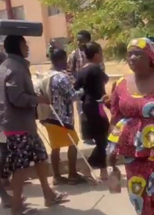 group of people walking along a street in front of a light-colored building and some trees. Several people appear to be blind, using white canes to navigate. One person carries a box on their head. Other people are walking with them. A woman in a colorful floral dress walks toward the camera.