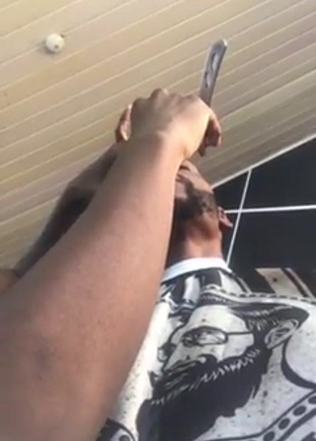 From a low-angle perspective, the video shows a person in a barber's cape with a beard