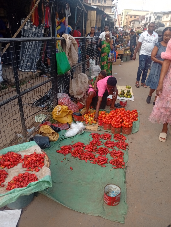 The image depicts an active outdoor market scene on a paved surface in Fegge, Nigeria