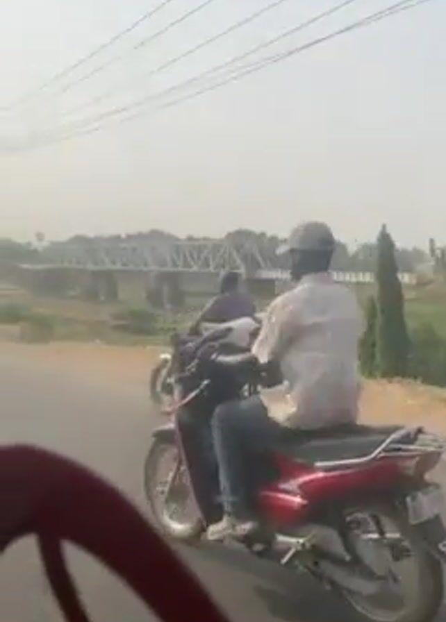 view from a vehicle traveling along a road in what appears to be a rural area. The day is bright, though hazy. In the distance, a steel truss bridge spans a river. The road runs parallel to the river. Power lines and poles are visible along the roadside. People are seen walking along the side of the road. Motorcycles pass by on the road. The camera is looking out the side window of the vehicle, and a portion of the vehicle's interior, possibly part of a seat or dashboard, is visible in the foreground.