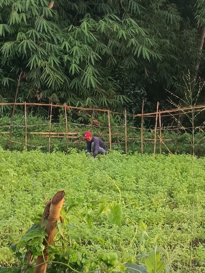 A person in a red cap and dark clothing tends to a lush, green field. The field is enclosed by a rustic, woven fence. Dense bamboo forest forms a backdrop. The scene evokes a sense of rural simplicity. Tall grass and leaves grow in the foreground.