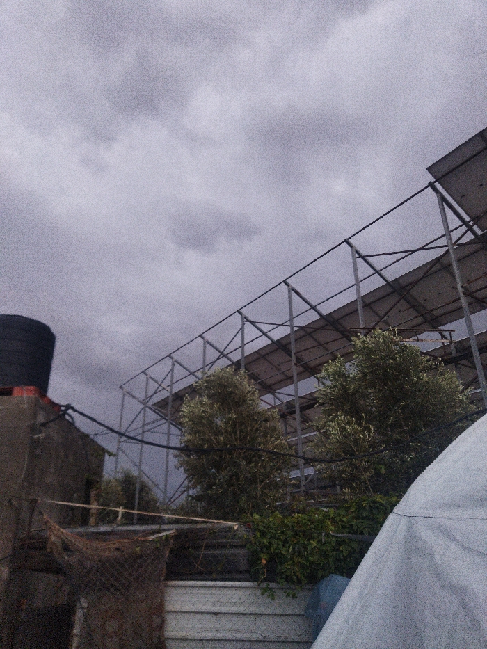 The scene depicts an outdoor environment in Khan Yunis, Palestinian Territory, under an overcast, cloudy grey sky. In the mid-ground, a large metallic framework, possibly part of a greenhouse or a support structure for solar panels, extends diagonally from mid-right to upper-right. This framework supports numerous rectangular panels, likely solar panels or translucent roofing. In front of this structure, several medium-sized trees with light green foliage are visible, along with darker green, dense shrubbery or vines below them. On the far left, a rough concrete structure supports a black, cylindrical water tank. Dark cables or pipes extend from this concrete structure. In the lower-left foreground, a brown, net-like material is partially visible, appearing draped or tangled. The lower-right foreground is occupied by a large, light-colored tarp or cover, partially obscuring an object beneath it. No individuals are present. The overall image exhibits a grainy texture.