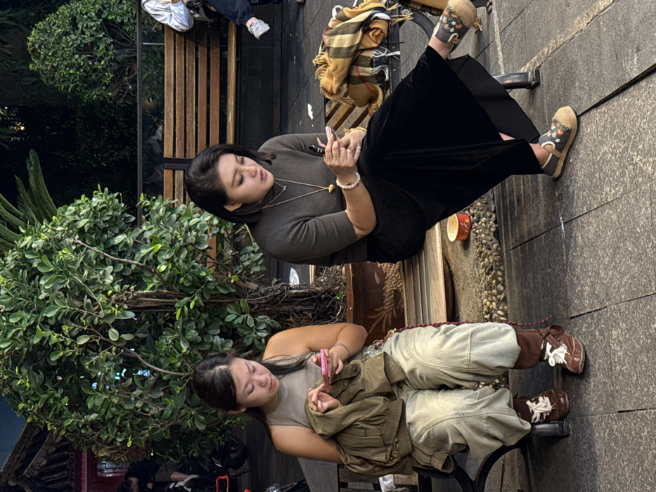 The image depicts an outdoor, artificially lit nighttime scene in Yuzhong District, China. Two East Asian adult females are seated on a dark-framed wooden-slat bench in the foreground. The female on the left wears a light grey sleeveless top, light-colored cargo-style pants with dark trim, and brown lace-up boots with white laces. Her dark hair is long. She holds a pink smartphone in both hands, looking down at it. An olive-green jacket or garment rests on her lap. The female on the right has dark, chin-length hair. She wears a dark grey short-sleeved mock-neck top, a long black velvet skirt, and light brown embroidered flat shoes. She has multiple layered necklaces, a white beaded bracelet on her right wrist, and rings on her fingers. She holds a black smartphone in her right hand, looking down at it. A plaid blanket or shawl is draped over the bench to her right. A red and white paper cup or container is on the paved ground beneath the bench near her feet. Both individuals are engaged with their mobile phones, displaying no direct interaction with each other. A large potted plant with dense green foliage stands behind and between them. The ground is paved with grey flagstones. In the background, additional benches, green vegetation, and indistinct architectural elements, including a traditional-style roof on the far left, are visible. A partial view of a person near a scooter or motorcycle is on the far left, and another person is partially visible on a distant bench on the far right.