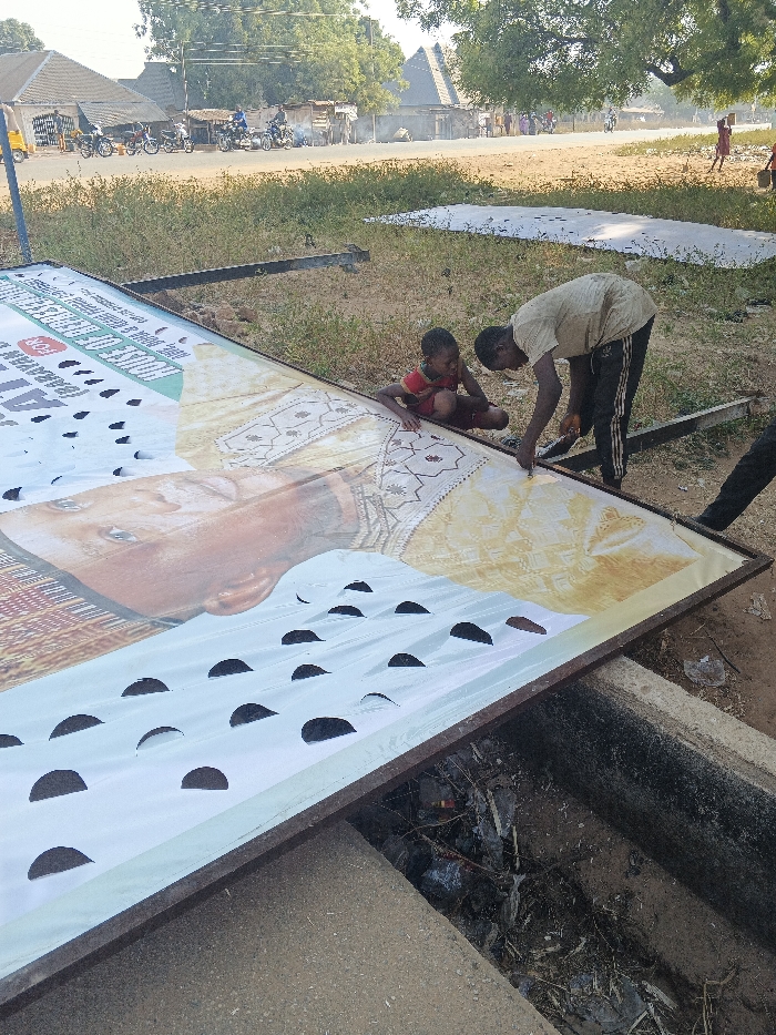 The image presents an outdoor scene in Doma, Nigeria, captured during daylight. In the immediate foreground and mid-ground, a large, rectangular billboard, approximately 3-4 meters in length, lies diagonally across an expanse of dry dirt and sparse grass. The billboard features a dark metal frame surrounding a printed banner. The banner displays a significant portion of a portrait of an individual, likely male, wearing a yellow patterned cap and traditional attire. Visible text on the banner includes fragments such as "PEOPLE" and other English words, along with green and white graphical elements, indicative of a political campaign. The lower-left section of the banner exhibits multiple rows of uniformly spaced, dark, semi-circular perforations. Two individuals are actively engaged with the billboard. On the right, an adult or older youth, dressed in a light-colored short-sleeved shirt and dark pants with white stripes, is bent over, manipulating the banner material with a small, light-colored hand tool near its frame. To his left, a younger male child, wearing a red short-sleeved shirt and dark shorts, squats on the ground, observing the activity. Beneath the billboard's lower edge, an open concrete drainage ditch filled with dark liquid and debris is visible. The background reveals a horizontal, unpaved road. Along this road, several low-rise buildings with varied roof structures are present. At least five motorcycles are visible, parked or in motion, on the left side of the road, alongside a partially visible yellow tricycle. Trees with green foliage are scattered across the landscape, and several indistinct human figures are discernible walking or standing along the road and in distant grassy areas. The environment is characterized by dry ground, sparse vegetation, and clear skies, consistent with a semi-urban or rural-urban fringe setting.