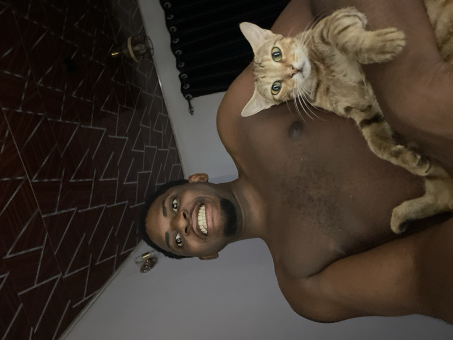 A smiling man with dark hair and a beard poses shirtless with a tan cat. The cat sprawls across his chest, looking directly at the camera with green eyes. The background features a dark tiled wall with a decorative light fixture and a black curtain. The photo is rotated, with the wall appearing to be the floor.