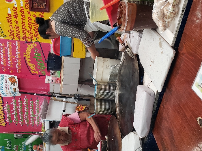 Two women are working in a food stall. The stall is decorated with colorful signs listing the ingredients and menu items. One woman, in a patterned blouse, is preparing food behind a counter with various containers. The other woman, wearing a red dress, works on a lower surface. The ingredients and food are visible on the counter, including possible meat and sauces. The stall seems to offer a variety of quesadillas with ingredients such as chorizo and mushroom.