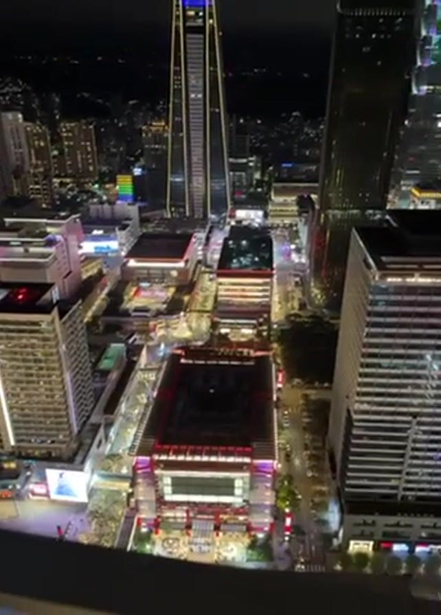 nighttime aerial view of a brightly lit city, focusing on a cluster of commercial buildings and skyscrapers. The buildings below are predominantly rectangular, with distinct red and white lighting outlining their structures. The streets between the buildings are illuminated, showing pedestrian activity. Tall skyscrapers surround the lower buildings, some illuminated with colorful lights reaching high into the night sky.