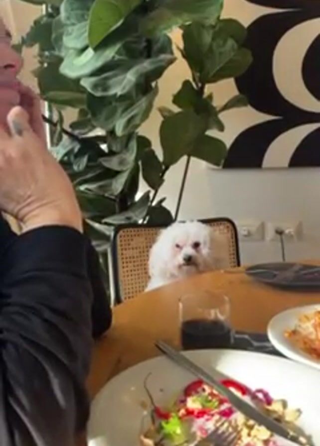 A woman is sitting at a table in a room with a large green plant and a black and white patterned wall hanging. The table is wooden and has a plate with leftover salad, a glass of red liquid, and another plate with food. A small white dog sits in a wicker chair across the table from the woman, looking at the camera. The woman is wearing a black top and has a tattoo on her arm. She is touching her face with her hands. The room is bright with natural light.