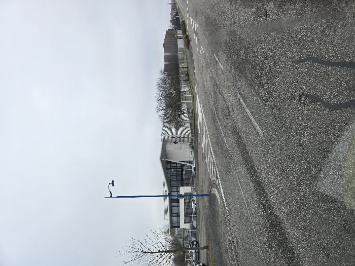 The image depicts a street scene in Eschau, France, under an overcast, light grey sky. In the immediate foreground, a dark asphalt road with visible wear, patching, and white lane markings extends from the bottom of the frame, curving slightly right. A white zebra-style pedestrian crossing is present on the left side of the road, leading towards a paved area. A leafless deciduous tree stands on the far left, and a tall, slender blue streetlamp with a dark fixture is centrally positioned near the road's edge. To the left of the road, in the midground, is a paved parking lot containing at least five parked dark-colored passenger vehicles. Behind the parking lot, a two-story modern building with a light-colored facade, dark-framed windows, and a prominent white and dark striped pattern on one section is visible. A solitary individual, wearing a dark red or purple top, is seen near the building's entrance area. Further to the right in the midground, the road or a paved area continues, bordered by a low white concrete structure. In the background, a row of bare trees and dense green shrubbery is visible behind a fence, with a large, dark-colored rectangular industrial or commercial building situated in the far right background.