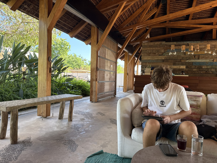 This image depicts an open-air lounge or common area in Kendwa, Tanzania, characterized by a substantial wooden architectural design. The ceiling features a complex network of exposed wooden beams and rafters, supporting a slatted wooden roof. Large, square-cut wooden pillars provide structural support. The floor is concrete with gray, stenciled, or inlaid patterned areas. On the right, a young male, light-skinned with medium-length brown hair, is seated on a light-colored, upholstered sofa. He wears a white t-shirt with a black "Timberland" logo and blue denim shorts. He is looking down and actively interacting with a black tablet device held in both hands. On a low, circular, dark-toned table in front of him, a black smartphone (face down), a glass containing a dark red liquid, and a clear glass filled with water are present. A dark bag is partially visible next to him on the sofa. To the left, a rustic wooden bench, constructed from unrefined wood planks and legs, rests on the concrete floor. Beyond the structure's open side, a lush tropical environment is visible, featuring various green leafy plants and trees under a clear blue sky. In the background, a distinctive wall constructed from horizontally stacked, multi-colored wooden planks serves as a decorative element, above which several clear glass pendant lights are suspended. An open doorway with a roll-up style wooden door is visible further back on the left, leading to an exterior area.