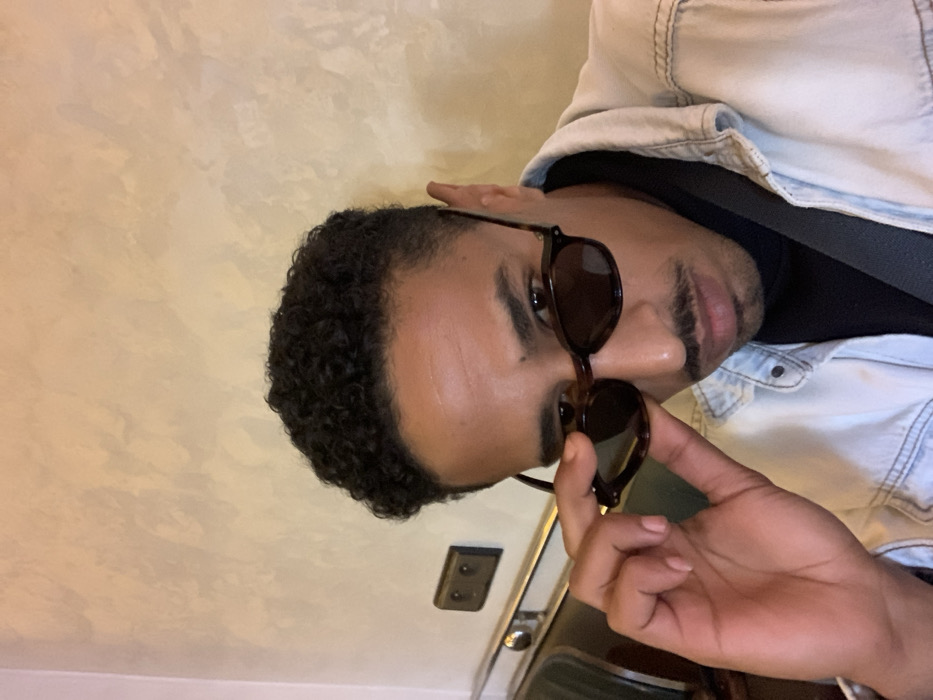 A close-up indoor portrait features a male subject, of apparent North African or Middle Eastern descent, with dark curly hair and a mustache. He wears a light-colored denim collared shirt over a black turtleneck. His right hand holds the bridge of his dark, tortoiseshell-patterned sunglasses, lowering them to reveal his brown eyes, which are directed forward. The background consists of a textured, light beige wall. To the subject's left, a dark brown rectangular electrical outlet is mounted on the wall, beneath which a metallic bar and a section of dark green upholstered seating are visible. The scene is situated in what is reported to be Tangier, Morocco.