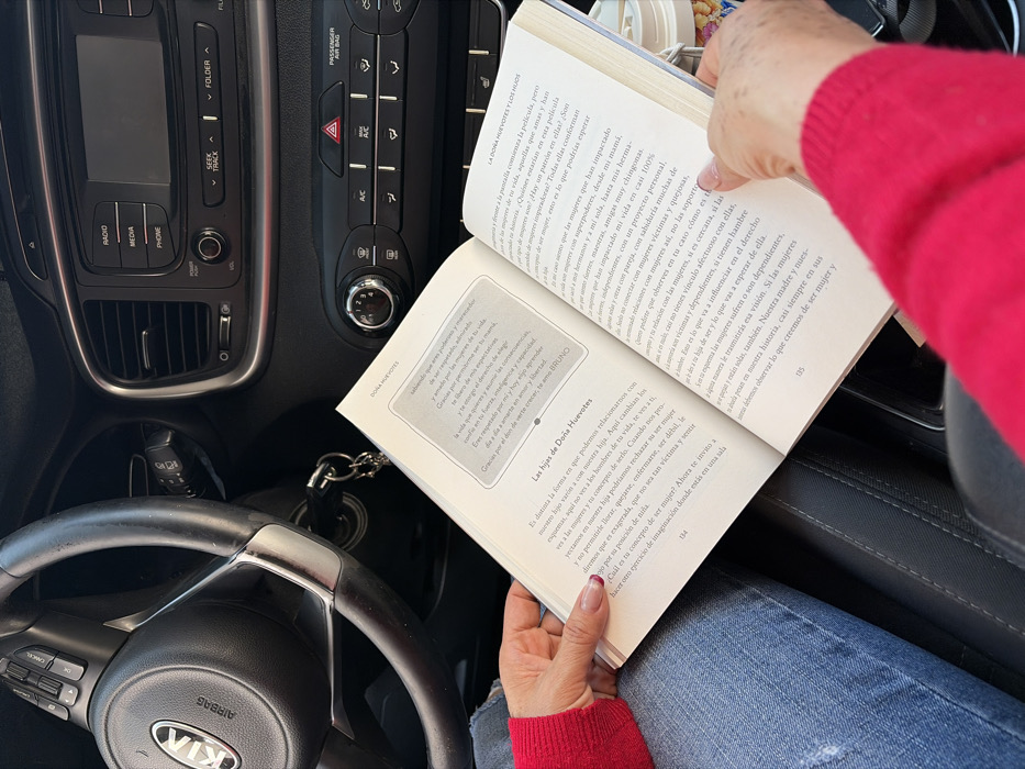 person sitting in the driver's seat of a KIA car, holding open a book titled "La Dona Huevotes Y Los Hijos." The book appears to be in Spanish and is opened to pages 134 and 135. Page 134 references "Las Hijas de Dona Huevotes." Page 135 has text about how a woman's relationships with other women in her life impacts how she sees herself. The person is wearing a red top and blue jeans. The car dashboard and steering wheel are also visible. The car keys are dangling from the steering column.
