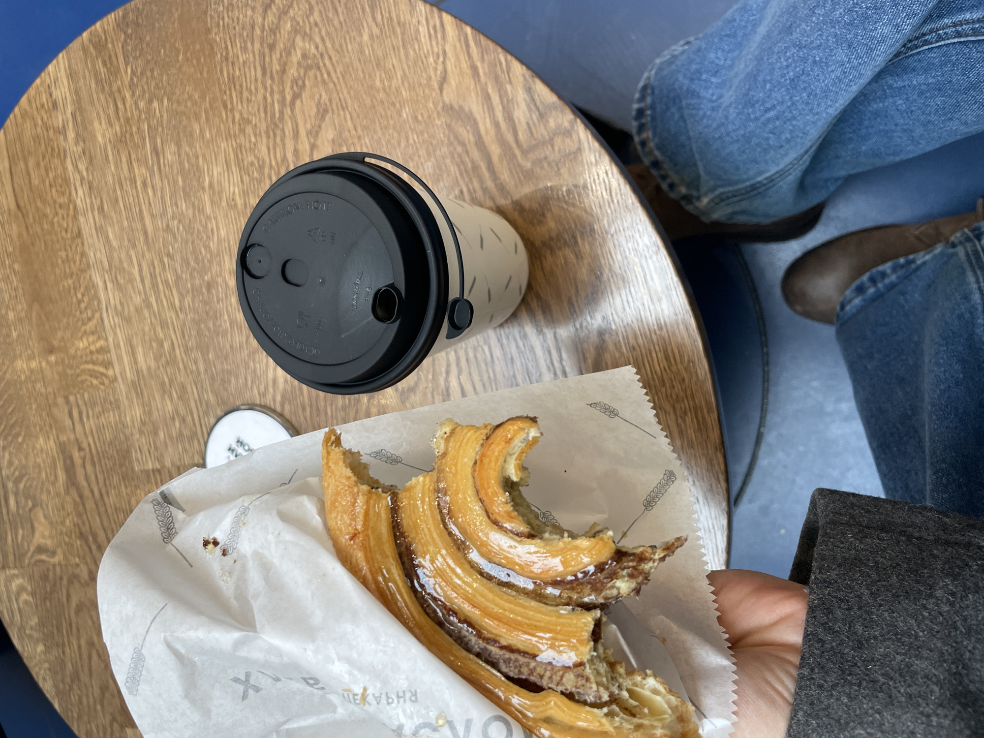 The image depicts a first-person perspective looking down at a casual indoor setting. A person's left hand, covered by a grey coat sleeve, holds a partially consumed pastry, likely a cinnamon roll or Danish, wrapped in white paper. The pastry features a golden-brown, glazed exterior with visible layers and a dark, possibly chocolate or cinnamon, filling. A significant portion has been bitten off from the pastry's end. The white paper wrapper has faint Cyrillic text, including "ХЛЕБ" (bread), and wheat stalk illustrations. To the right, a white disposable paper coffee cup with a black plastic lid rests on a round wooden table. The lid is inscribed with "ОСТОРОЖНО ГОРЯЧО!" (Caution Hot!) in Russian and English, and the web address "www.vzd.ru". The person's legs, clad in blue denim jeans, are visible below the table. A brown boot toe is also visible on the blue flooring or base of the seating structure. The "www.vzd.ru" domain and Cyrillic text identify the location as a VkusVill (Вкусвилл) establishment, a popular chain of grocery stores and cafes, specifically within the city of Moscow, Russia.