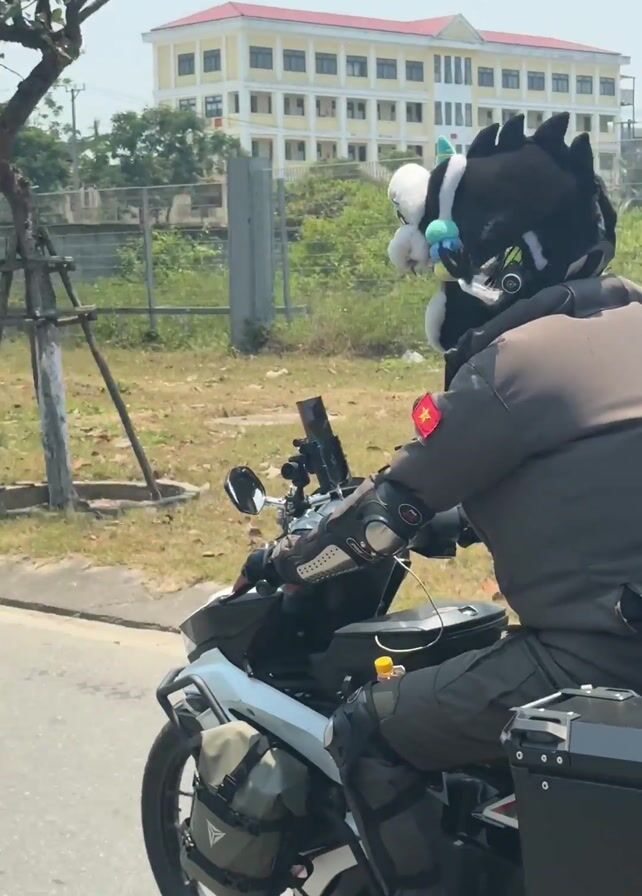 A person is riding a white motorcycle down a road on a sunny day. The rider is wearing a black jacket, pants, gloves, and a uniquely decorated motorcycle helmet that has black spikes and what appear to be plush toys attached to it. The Vietnamese flag is visible on the sleeve of their jacket. The motorcycle has a black storage box mounted on the back and green saddlebags on the sides. As the motorcycle drives, the video captures different buildings and vegetation in the background, along with the road and curb. The video is shot from a moving perspective, suggesting the camera is on another vehicle following the motorcycle.