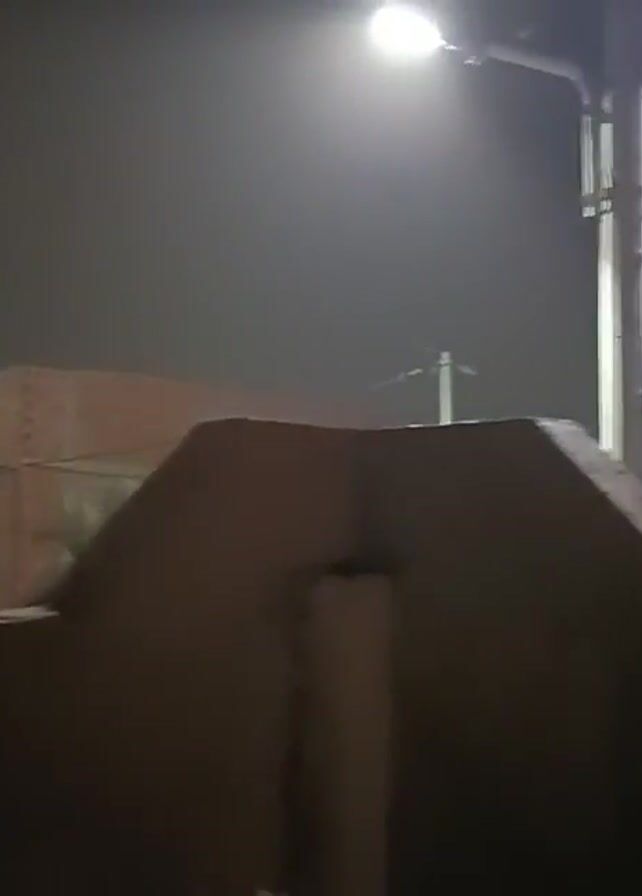 The video presents a nighttime urban scene, characterized by the pervasive presence of fog or smog that obscures visibility. A street light, mounted on a white utility pole with visible wires and cable attachments, casts a diffused glow. The background features indistinct buildings and structures, their details softened by the hazy atmosphere. A dark-colored wall or barrier occupies the lower portion of the frame, adding to the depth of field. The overall tone is muted and somewhat dim due to the fog and limited lighting.