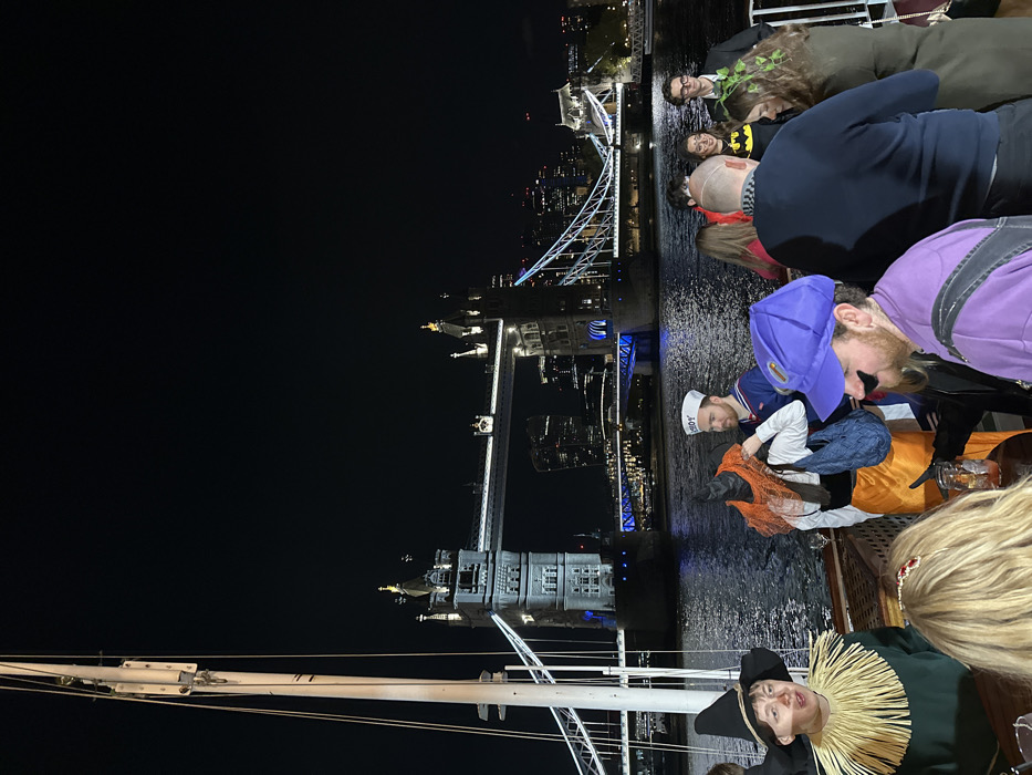 The image displays a nighttime scene on the River Thames in London, United Kingdom, viewed from the deck of a vessel. Tower Bridge is prominently featured in the background, illuminated with white and blue lighting across its towers and suspension elements. The London skyline, including several illuminated high-rise buildings, is visible beyond the bridge. The dark river surface reflects ambient light. In the foreground, approximately ten individuals are visible on the boat's deck. Many are dressed in various costumes. On the far left, a person wears a scarecrow costume consisting of a dark green top, a straw-like collar, and a dark pointed hat. Slightly right of center, a person in an orange witch costume with a pointed hat holds a blue denim-like bag. Next to them, a male wears a white sailor's cap with text (partially obscured, possibly "AHHOY") and a striped top. Further right, a male wears a purple baseball cap, a fake black mustache, and a purple garment. Other visible individuals include a female wearing glasses and a black top with a yellow Batman logo, a male in a dark suit and glasses, and a female with green leafy adornments on her head. A tall white mast and associated rigging of the boat are visible on the left side of the frame. People are standing and interacting on the boat's wooden deck, some holding glasses with beverages.