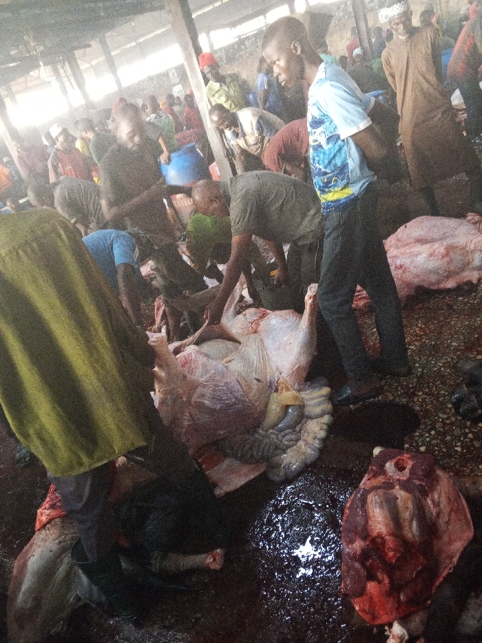 The image displays an active indoor butchery scene located in Kofar Mazugal, Nigeria