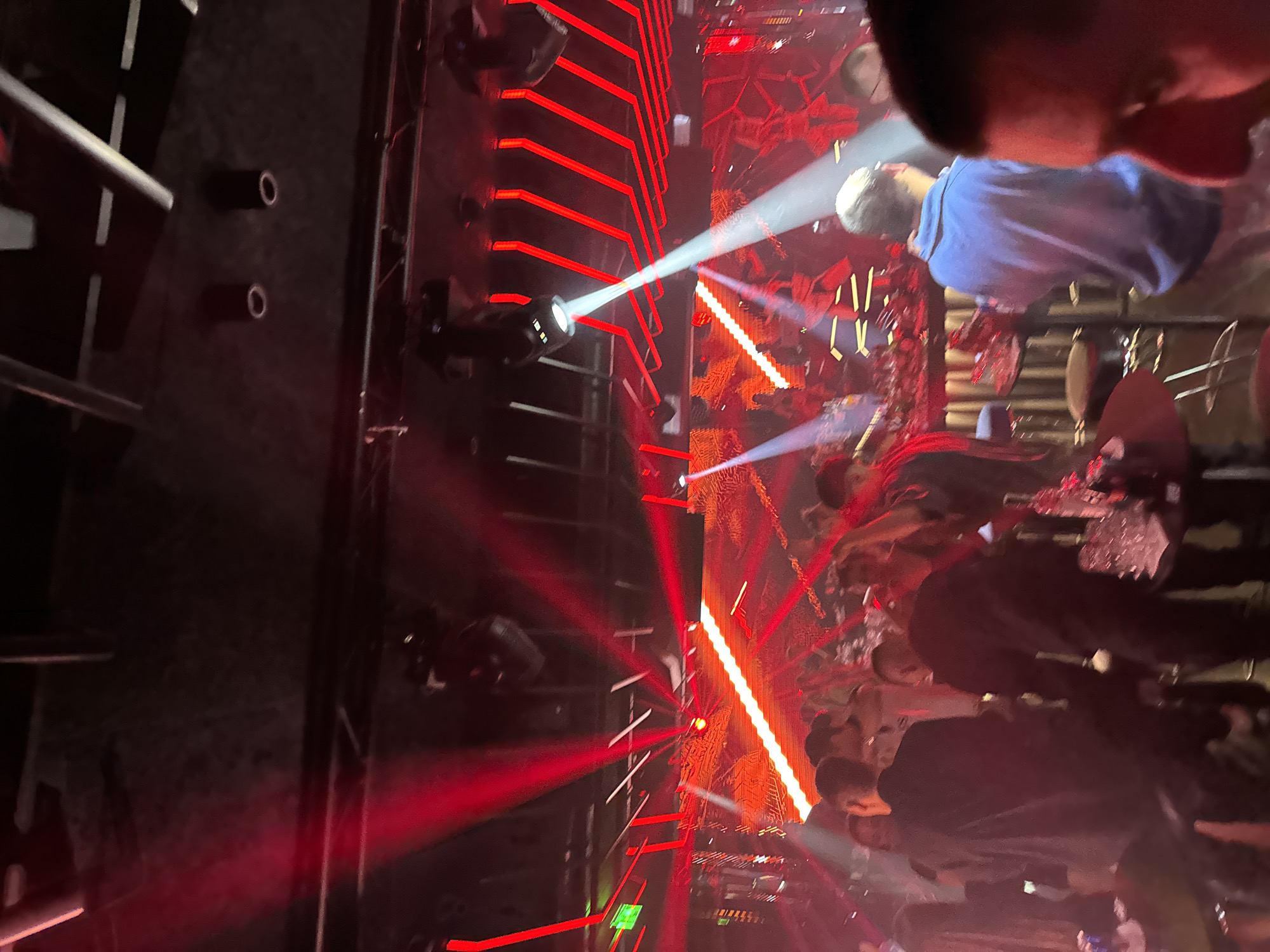 The image depicts the interior of Club BEDROOM Premium, located in Sofia, Bulgaria. The scene is a crowded nightclub environment, dominated by intense red lighting emanating from numerous linear LED strips and patterned projections on walls and screens, combined with multiple white spotlights cutting through the smoky atmosphere. Approximately 20-30 individuals are visible, mostly in motion or partially obscured, suggesting a lively gathering. People are standing throughout the venue, some appearing to socialize at high-top tables equipped with bottles and glassware. One individual in a blue polo shirt is visible from the back, facing towards the club's main area. A blurred partial view of a person's head and shoulder is in the extreme foreground on the right. The club's infrastructure includes a high ceiling from which numerous stage lighting fixtures and sound speakers are suspended. A DJ booth, featuring equipment and a background display, is situated towards the rear of the visible area. The overall environment is dark, save for the dynamic red and white light effects, indicating an active nightlife setting.