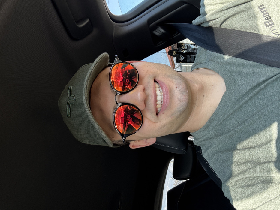 A male individual is depicted in a selfie, seated in the driver's seat of a vehicle during daylight hours