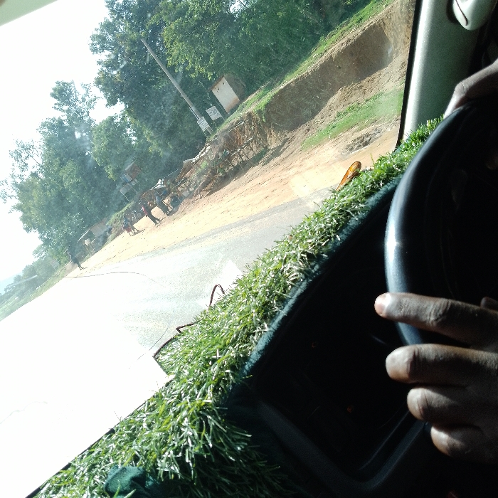 This image depicts a roadside scene in Kola ward, Kenya, viewed from inside a vehicle. In the foreground, a dark-skinned hand is positioned on a dark steering wheel, which is on the right side of the frame. The dashboard is covered with a green artificial turf material, upon which an amber-colored object rests. The windshield exhibits reflections and a faint horizontal crack. Outside the vehicle, a paved road surface is visible, bordered by a reddish-brown dirt shoulder on the right. An earthen embankment rises behind the shoulder. In the midground, several individuals, approximately three to five, are observed standing near rudimentary, makeshift structures or stalls constructed from wood and other materials. These structures are situated on the dirt shoulder. A utility pole stands vertically on the right side of the frame, with a small, light-colored building visible behind it. The background consists of dense green foliage and trees under bright natural light conditions.