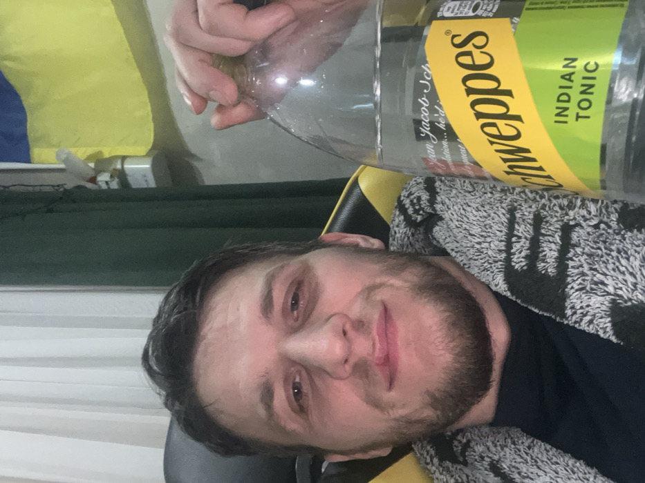 A selfie shows a man in a chair, wearing a dark shirt and gray, patterned cardigan. He holds a large bottle of Schweppes Indian Tonic above him. A yellow and blue flag hangs in the background near a window. The man has short brown hair and a trimmed beard. He is looking at the camera and smiling slightly.