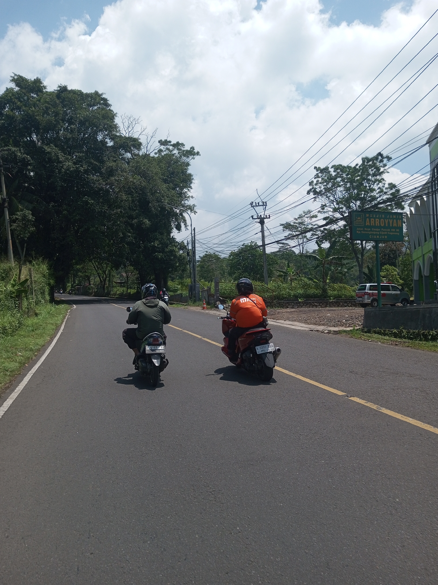 Two individuals are riding motorbikes along a paved road, demarcated by a yellow center line, in a rural setting. Lush vegetation lines the roadside, including trees. Overhead, power lines are visible against a backdrop of a partly cloudy sky. A green sign indicating "MASJID JAMIE ARROYYAN" stands to the side, revealing the location to be on Jalan Raya Cianjur Puncak KM 06, Kp. Gununglanjung Cijedil Cugenang, Cianjur. A white van is parked behind the sign. The motorbike ahead has a license plate that reads "F 6169 YA", while the motorbike behind has a license plate that reads "A 5261 XAA." The riders are wearing helmets.