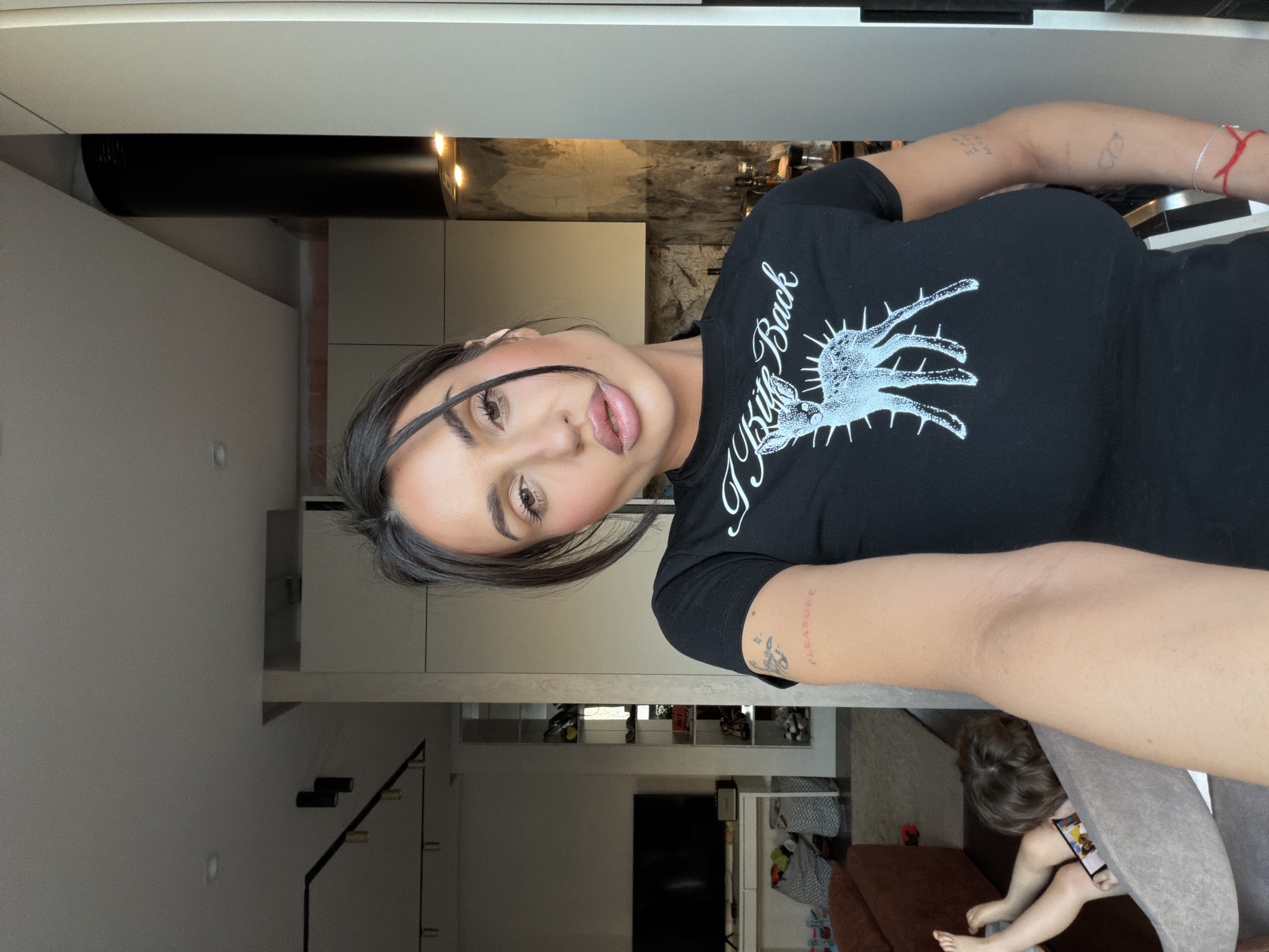 The image depicts an indoor residential scene, likely an open-plan living and kitchen area, in the city of Unknown, Unknown. In the foreground, a woman in her 20s or 30s with dark hair parted to the side is shown from the chest up, taking a selfie. She has defined eyebrows, winged eyeliner, and full lips with a glossy finish. She is wearing a fitted black short-sleeved t-shirt featuring a white graphic print of a deer-like animal surrounded by spikes, with the partially visible text "I Bite Back" above it. Tattoos are visible on both arms: a script-like tattoo reading "PLEASURE" on her right bicep, a small angelic figure and a star on her right shoulder, and faint designs on her left forearm. A red string bracelet is worn on her left wrist. She is looking directly at the camera with a slightly pouting expression. In the lower-left background, a young child with light brown hair is seated in a light grey upholstered chair, viewing a small electronic device. The child's bare feet are visible. Further into the left background, a living area includes a wall-mounted flat-screen television above a white console table, a partial view of a rust-colored sofa, and two grey fabric storage bins on the floor. A shelving unit with various items is also present. In the right background, a modern kitchen area features light-colored cabinets, a dark cylindrical range hood, and a dark, veined marble or stone backsplash behind visible bottles and jars on a counter. The ceiling is white with recessed lighting and a black cylindrical light fixture is visible overhead in the living area. Natural light enters from an unseen source to the left.