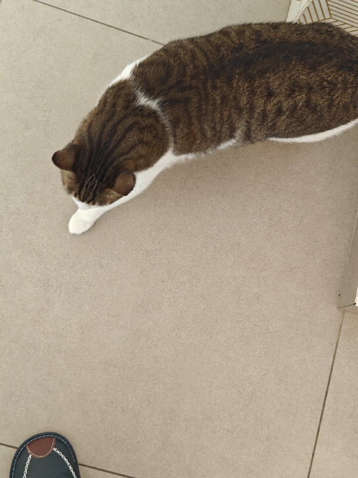The scene depicts an overhead view of an indoor setting in Karmiel, Israel, featuring a domestic cat and a human foot on a tiled floor. A tabby and white cat is positioned centrally, extending from the upper left towards the middle right of the frame. Its head is lowered and angled to the left, with its left front paw extended forward, seemingly touching the light beige ceramic tile floor. The cat's fur is predominantly brown and dark grey striped tabby on its back and head, with distinct white fur on its underside, paws, and parts of its face. In the bottom left corner, a human's foot, partially visible, is wearing a dark grey/blue sandal with brown and white stitching. The floor consists of large, rectangular light beige tiles with visible grout lines. A sliver of a white object, possibly furniture or a wall, with a subtle textured pattern is visible along the right edge of the frame.
