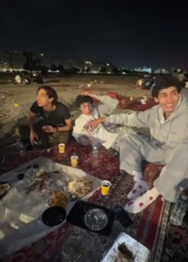 Three young men are sitting on a red rug laid on a dirt or gravel surface. The men are dressed casually in hoodies, T-shirts, and sweatpants. One man is lying down, another is sitting cross-legged, and the third is sitting with his legs outstretched. There are several paper cups and what appears to be leftover food scattered around the rug. In the background, there are other people sitting on rugs and a cityscape with illuminated buildings. The atmosphere seems relaxed, and the men are laughing and talking to each other.