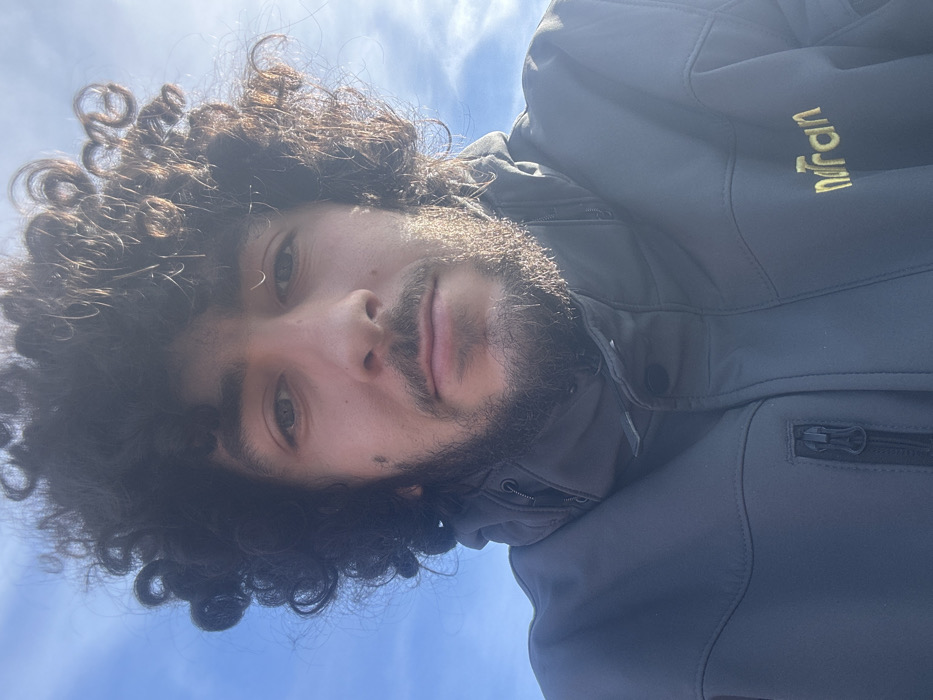 An upward-angled, close-up photograph depicts an adult male outdoors in Lambres-lez-Douai, France. The subject occupies the majority of the frame, facing forward and looking directly at the camera. He possesses dark, tightly curled, voluminous hair that is backlit, creating a halo effect. He has a full beard and mustache. A small dark mole or blemish is visible on his right cheek (viewer's left). He is wearing a dark grey or black softshell jacket with a zippered front and a stand-up collar secured by black buttons. A small zippered pocket is visible on the lower left side of the jacket. The right chest area features an embroidered yellow logo that reads "nuran". The background consists of a bright blue sky with scattered white clouds, indicating clear daytime conditions and suggesting the sun is positioned behind the subject.