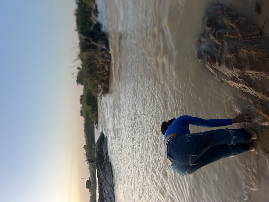The image captures a riparian scene in Rido, Nigeria, during what appears to be late afternoon or early evening, indicated by the soft, warm light and a sky transitioning from pale orange-yellow at the horizon to light blue overhead. In the foreground, a person is observed from behind, bent at the waist, with their bare feet partially submerged in a murky, brownish river. The individual has dark skin and braided hair tied up. They are dressed in a royal blue long-sleeved top and dark blue jeans that are distressed or torn at the bottom hems; a light-colored belt is visible at their waist. Their right hand is extended into the water, seemingly touching the riverbed or a submerged object. A large, dark rock is positioned immediately to the right of the person. The river itself displays visible currents and ripples, suggesting active flow. Further into the mid-ground, on the left side of the river, two indistinct figures are standing atop a prominent dark rock formation on what appears to be a bank or large island. Beyond them, a utility pole or similar structure is visible in the distance. The far banks and several small islands within the river are covered with dense green vegetation, including bushes and tall grasses. The water is consistent in its brownish coloration throughout the visible expanse of the river.