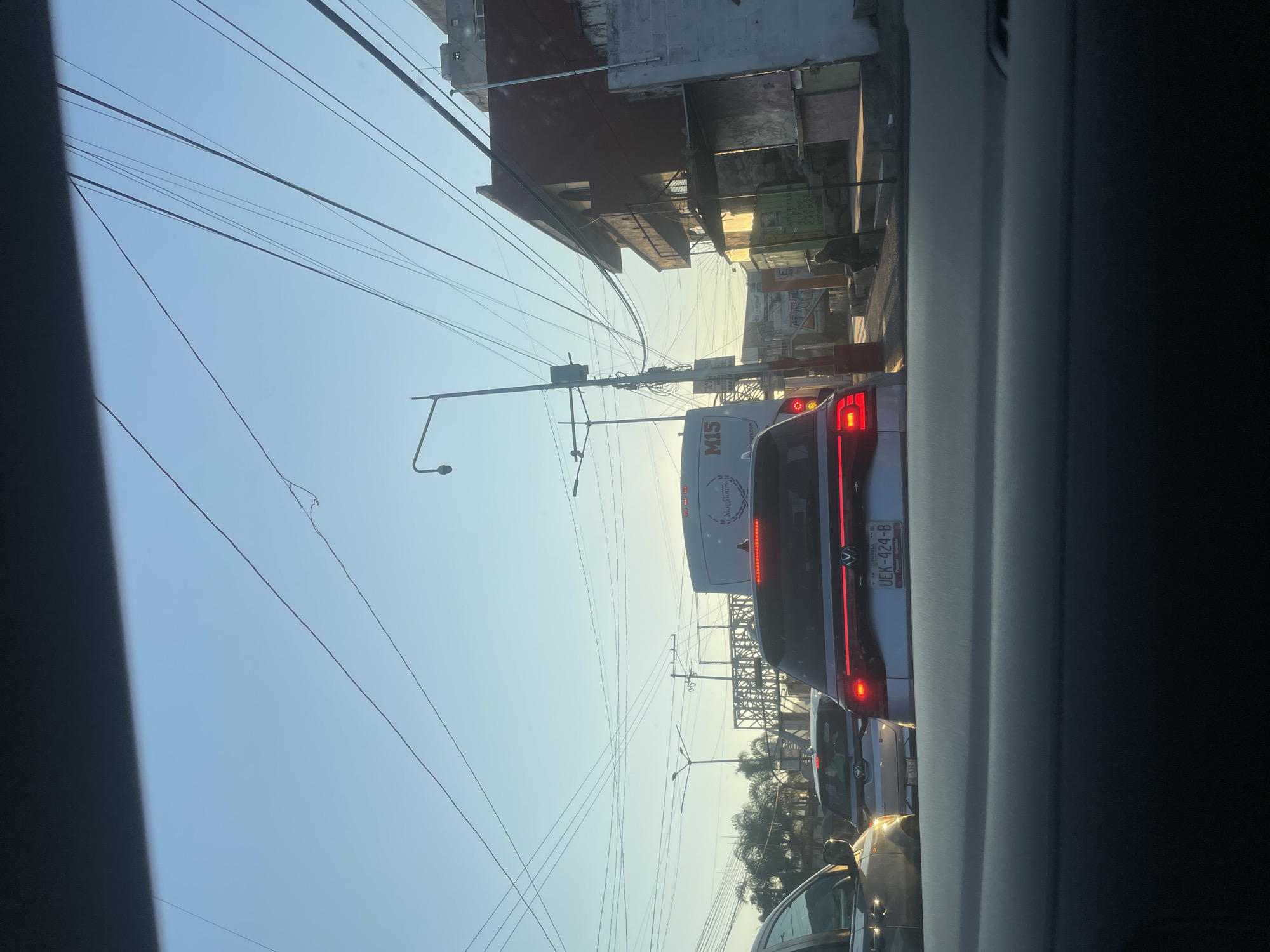 The image presents an urban street scene, likely within Casa Blanca, Mexico, observed from inside a vehicle. The time of day is either early morning or late afternoon, indicated by the low angle of the sun casting long shadows and bathing the environment in a warm, golden light against a clear, pale blue sky. Numerous overhead utility wires crisscross the upper portion of the frame. In the immediate foreground, the top edge of a vehicle's dashboard is visible. Directly ahead, a silver Volkswagen SUV is present with its red taillights illuminated and displaying Mexican license plate "UEK-424-B", registered in Puebla. Behind this vehicle, a silver Toyota SUV/car is partially visible, with a license plate ending in "539-A". To the left of the Volkswagen, a portion of a dark-colored vehicle is visible. Further down the street, a white bus or large van, bearing "Mogitours" and "M15" on its rear, is in traffic. On the right side of the street, a multi-story building with a red facade and a balcony is visible, showing signs of wear. Below it are several ground-level structures or stalls, possibly commercial, featuring signage and graffiti; one sign partially reads "APERTURA AUTOS Y CASAS". A lone individual, dressed in dark attire, is seated on a low concrete curb or structure adjacent to these stalls. Utility poles, streetlights, and traffic signals are present along the road. In the background, a metal overpass or pedestrian bridge structure spans the roadway, and palm trees are visible to the left. The vehicles appear to be stationary or moving slowly in a congested traffic environment.