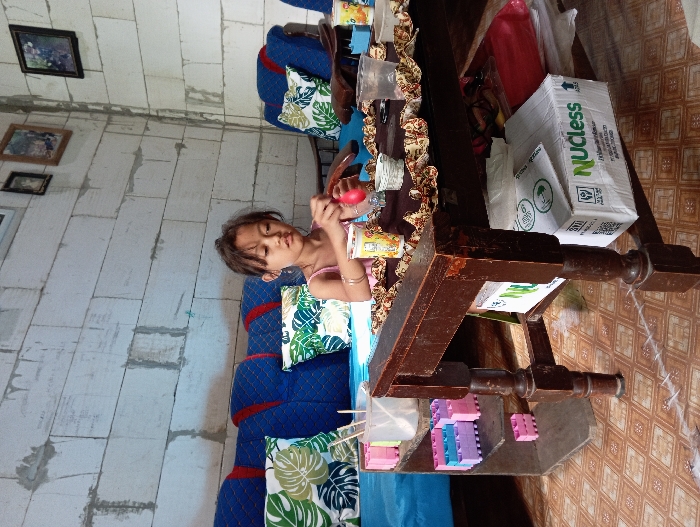 A young girl plays at a wooden table in a room. She holds a red object, possibly a toy. The table is covered with various items, including a box labeled "Nucless," cups, and toy blocks. A blue couch with patterned cushions is positioned near the table. Pictures adorn the white brick wall in the background. The floor has a patterned design.