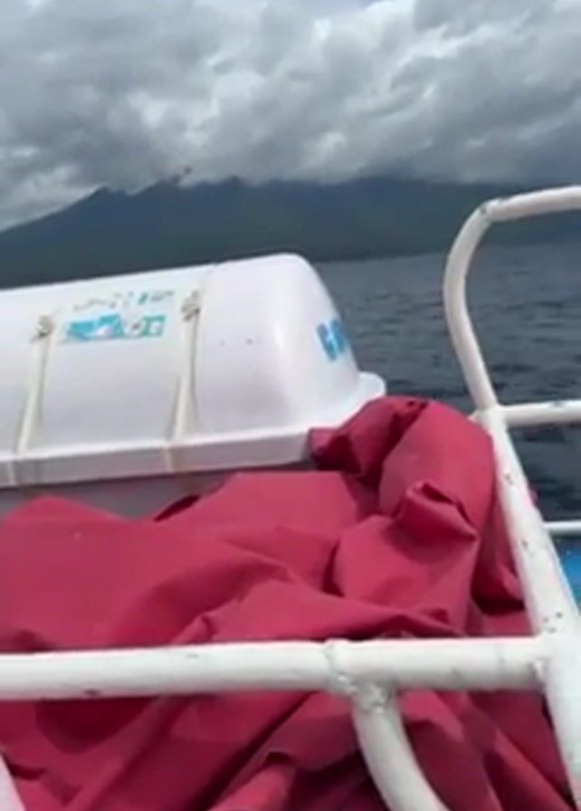 A medium-angle video shows a group of people riding on a boat, likely tourists, looking out onto the water, with land visible in the distance. The camera appears to be held by one of the passengers on the boat, with a view looking out toward the front of the boat. To the left is a white storage box with some sort of rope tied around it, covered with a red fabric. Some metal boat railing is in front of it. The water looks choppy. The camera swings slightly to the right, revealing more people sitting on the boat, including a young woman with a light green baseball cap and a ponytail, and another person in a black hat. Many passengers are seated cross-legged, casually chatting or watching the scenery. The sky is partly cloudy.