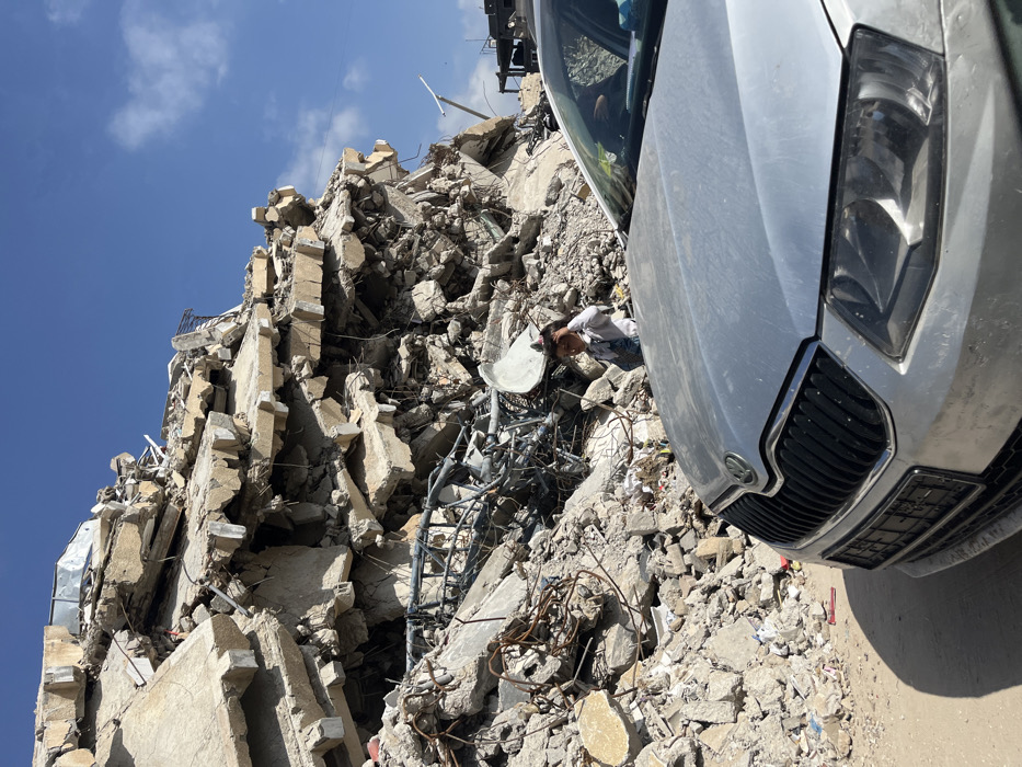 The image captures an outdoor scene in Khan Yunis, Palestinian Territory, under a clear blue sky with minimal cloud cover. A colossal mound of concrete rubble, twisted rebar, and building fragments, consistent with a collapsed multi-story structure, dominates the background. In the mid-ground, a young child, dressed in a light-colored top and dark overalls, stands amidst the debris, with their right hand touching their head. Visible within the rubble near the child is a large, curved white object. A silver Skoda automobile, seen from the front with its grille and headlights prominent, is parked on a dusty foreground surface, partially obscuring the view of the rubble to the left. Distant damaged structures are faintly visible on the horizon to the right, reinforcing the context of widespread destruction.