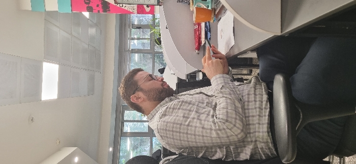 man sitting in an office chair, looking down at a tablet device. He is wearing a light-colored plaid shirt and dark pants. The man has a beard and glasses. He is seated at a desk with a cup and a piece of paper. The desk has a gray surface. In the background, there are multiple windows with blinds, and a light-colored ceiling with square tiles.
