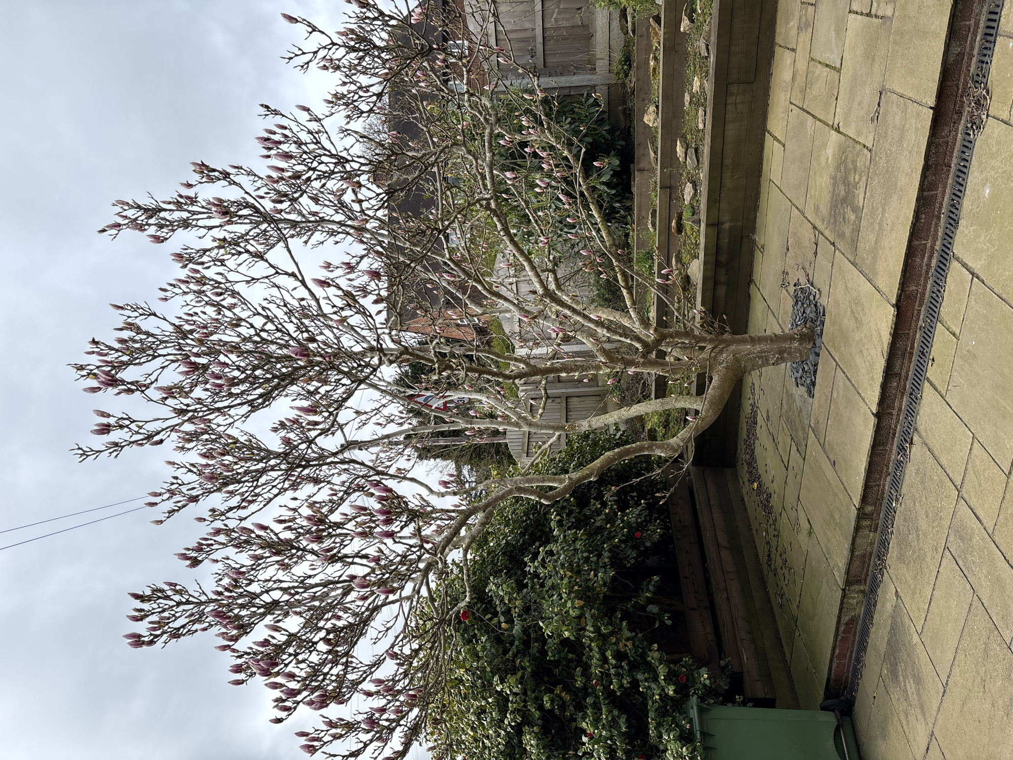 The image depicts a residential garden in Pulverbatch, United Kingdom, on an overcast day. A prominent, mature magnolia tree stands centrally, exhibiting numerous closed pink flower buds on its leafless branches. The tree is planted within a small bed of dark grey aggregate stones, embedded into a patio composed of light-colored rectangular paving slabs. This elevated patio section is separated from a lower, similarly paved area by a brick step and a black-grated linear drainage channel. To the left of the main tree, a dense, dark green evergreen shrub, showing occasional red blooms, occupies an area behind a low wooden retaining wall. A green wheelie bin is partially visible at the far left edge, positioned next to this shrub. To the right of the main tree, a tiered garden bed with wooden retaining walls contains soil and scattered rocks. A wooden fence marks the property boundary in the mid-ground. Beyond the fence, a red brick residential building with a dark tiled roof is partially visible through the tree branches. Further right, another smaller tree with similar pink buds, and a utility pole with a partially obscured road sign (red-bordered triangular sign, possibly indicating a curve or hazard) are discernible. Overhead, power lines traverse the grey, uniformly cloudy sky. No individuals or animals are present in the scene.