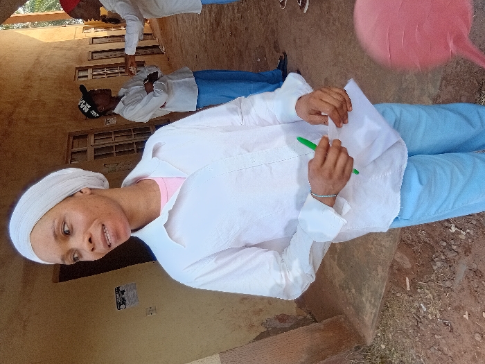 A woman wearing a white head covering, pink shirt, and white overshirt poses with a green pen and white paper. She is smiling. Two additional people are visible behind her, both wearing white tops and blue bottoms. The setting appears to be outdoors next to a light-colored building with windows. A pink object is visible in the top right of the image.