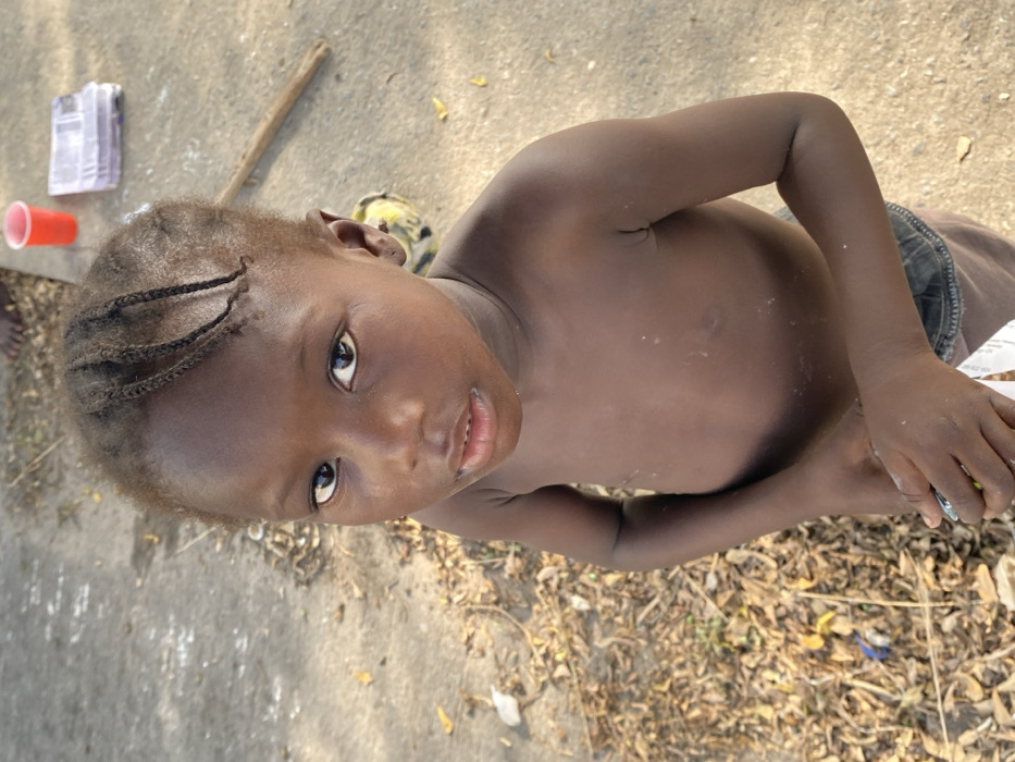 A young, dark-skinned child with braided hair looks up at the camera. They are shirtless and appear to be standing on concrete near a pile of dry leaves and debris. A red cup, some papers, and a small wooden stick are visible on the concrete nearby. The child's expression is curious and slightly earnest.