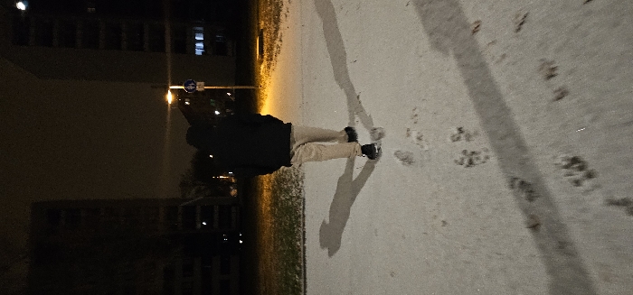 A person in a black hoodie and light pants walks on a paved path at night. The path is illuminated by a distant streetlight, casting a long shadow of the person. Animal footprints are visible in the snow-covered area beside the path. A building is visible in the background.