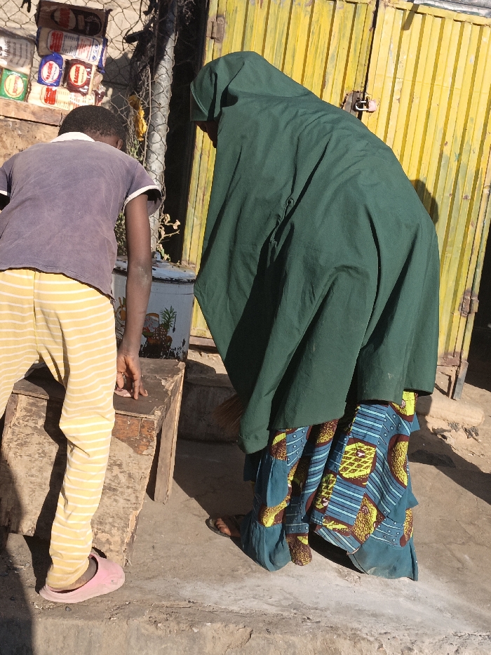 A child in yellow striped pants and a purple t-shirt stands next to a wooden box. They are wearing pink sandals. Next to them is a person shrouded in a large, dark green garment that obscures their features. The person wears a colorful patterned skirt. The scene is set in front of a yellow corrugated metal wall and a wire fence with various items displayed behind it. The ground is concrete.