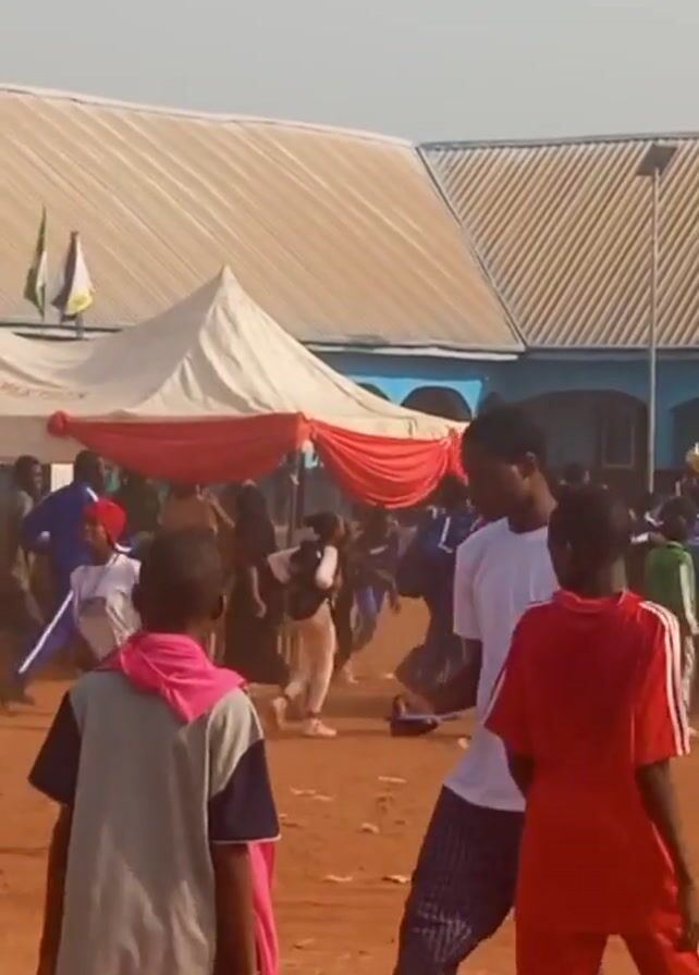 n outdoor event with a crowd of people on a red dirt ground. Many are wearing athletic attire in various colors like blue, red, purple, and green, suggesting a sporting or school event. A large white tent with red accents is set up in the background, next to a light blue building with a silver roof and multiple windows. Several people are walking and running, and some are holding long poles. The overall atmosphere seems lively and active.