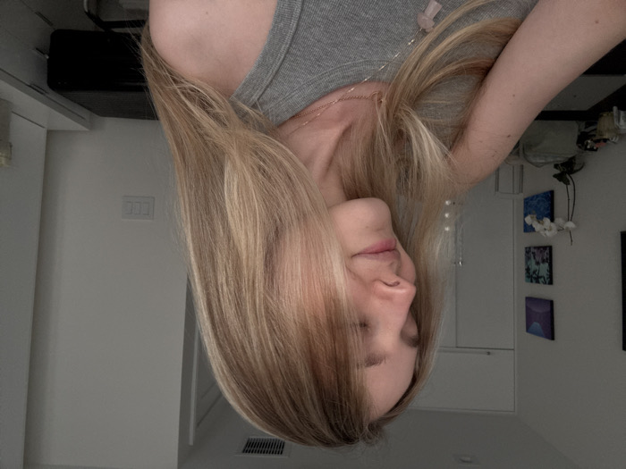 The image displays a female subject in an indoor residential setting in Coral Gables, United States of America. The subject, seen in profile facing right, has long, blonde hair with highlights, extending over her shoulders. Her eyes are closed, and she exhibits a subtle smile. She wears a grey sleeveless top and a thin gold-colored chain necklace with a light pink, mushroom-shaped pendant. Her right arm, partially visible in the lower left, shows several small moles. The background consists of light-colored walls. On the left wall, three small square abstract paintings are vertically arranged: a top purple/blue abstract, a middle multi-colored abstract, and a bottom blue/white abstract. Below these paintings, a white orchid plant with multiple blooms is situated in a container. Indistinct items, including a white vessel, are visible on a surface below the orchid. A white closet door is partially visible behind the subject's head on the left. On the right wall, a white triple-gang light switch is mounted below a rectangular ventilation grate. To the far right, a white dresser or cabinet is partially visible, with a dark, rectangular object resting on its surface. The scene is illuminated by ambient light, appearing to originate from the right side of the frame.